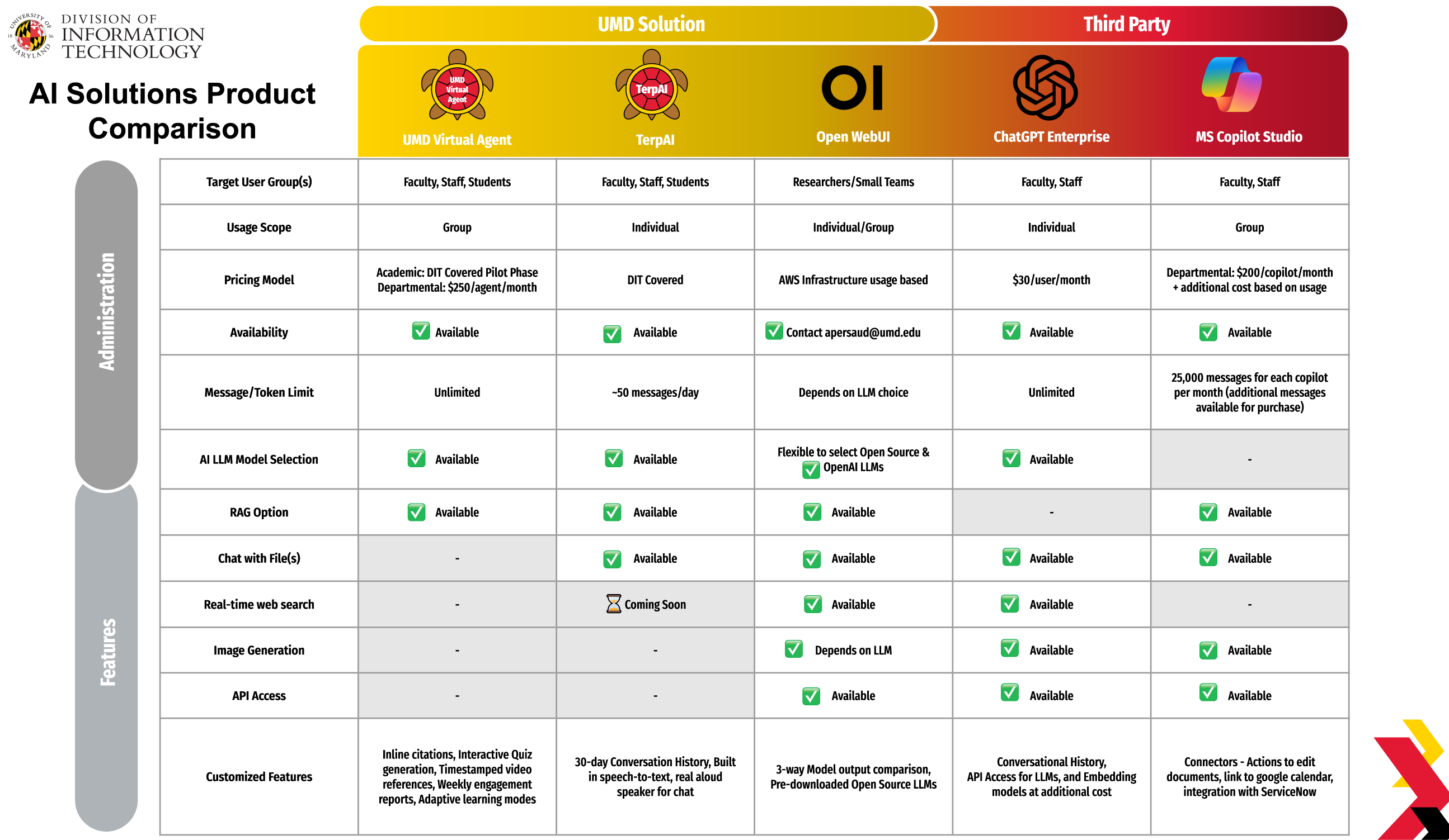 A growing list of services that leverage AI capabilities is available to UMD community members. Download the AI Solutions Product Comparison matrix.